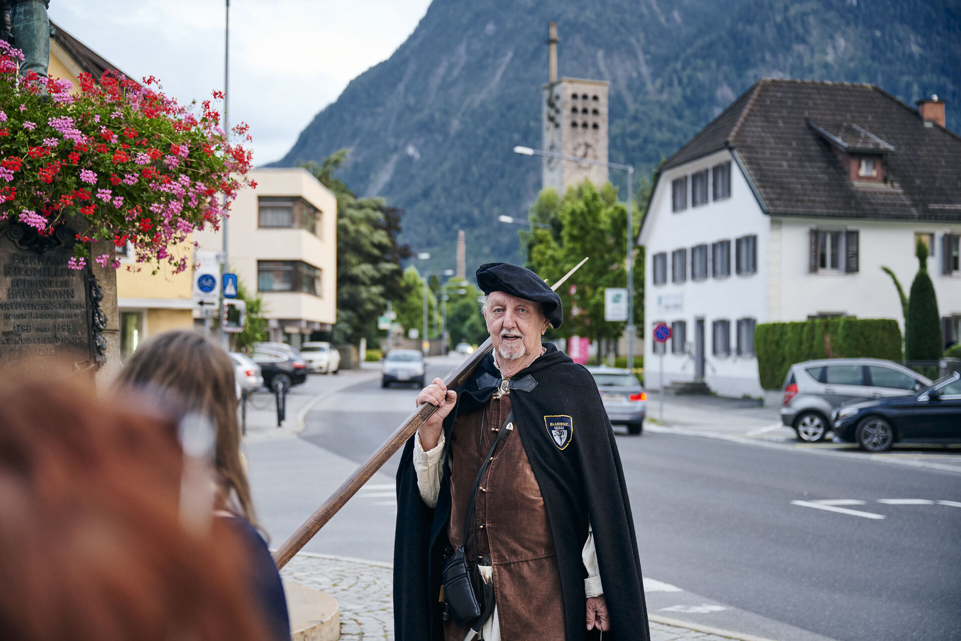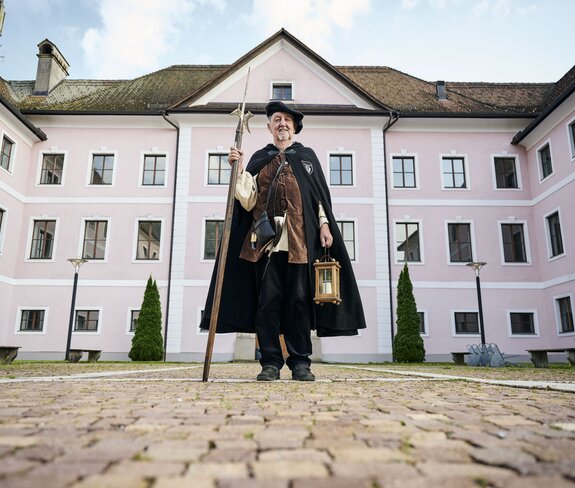 Ein letztes Foto mit dem funkelnden nächtlichen Bludenz im Hintergrund, und schon geht es weiter. Markus möchte uns noch die mittelalterlichen Gassen der Altstadt zeigen und uns in die Aufgaben eines Nachtwächters einweihen. Jahrhundertelang wachte er über den sicheren Schlaf der Bürger, patrouillierte bei Dunkelheit durch die Straßen und Gassen, sorgte für Ruhe, warnte vor Dieben und Bränden und rief die Stunde aus – in Bludenz bis in die 1970er-Jahre.