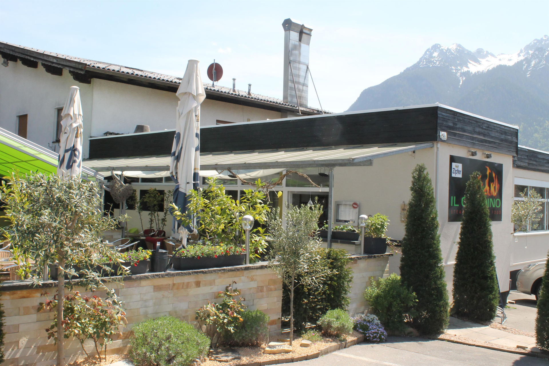 Genieße frisch zubereitete Pizza aus dem Steinofen, hausgemachte Pasta, saftige Steaks und mediterrane Spezialitäten inmitten der Alpen am Fuße des Muttersbergs.
