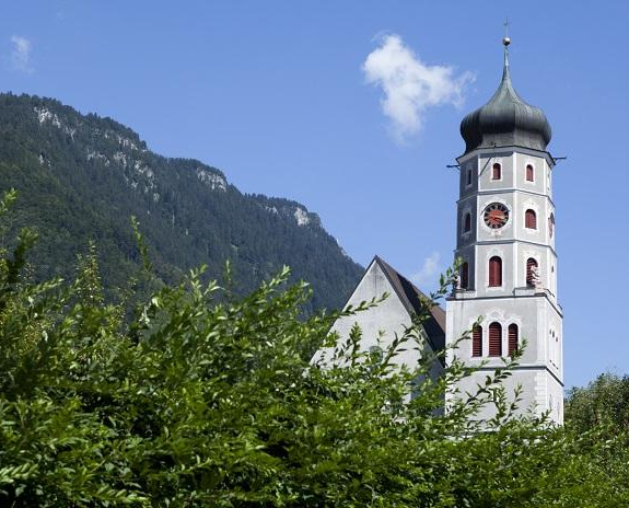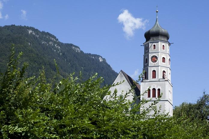 Der Glockenturm wurde 1667 bis 1670 nach den Plänen des Feldkircher Jesuitenpaters Maximilian von Lerchenfeld errichtet. Über dem viereckigen Grundturm, der oben an den Ecken vier Evangelienbüsten trägt, folgt ein dreigeschossiger Achteckturm mit Rundbogenöffnungen und Zwiebelhaube. Das Geläute besteht aus fünf Glocken, wovon zwei so wertvoll sind, dass sie in beiden Weltkriegen nicht eingeschmolzen wurden.