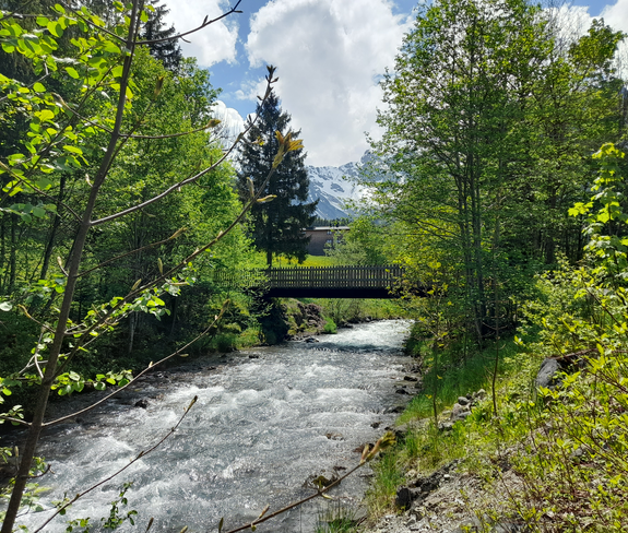 Ruhiger, teilweise schattiger Spazierweg entlang es Alvierbaches in Brand.