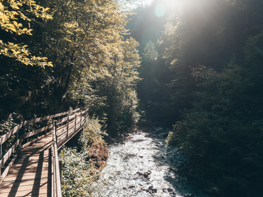 Die Bürser Schlucht ist ein beliebtes Ausflugsziel und ideal für Familienausflüge. Von der Ortsmitte führt der naturbelassene Schluchtweg durch riesige Konglomeratblöcke taleinwärts am Alvierbach entlang. Abwechselnd geht es über schmale Brücken mehrmals hin und her. Der Weg wendet und führt steil nach rechts hoch, zum höchsten Punkt der Tour. Hier wäre ein Aufstieg nach Bürserberg möglich (25 min zusätzlich). Bergab erreicht man über einen breiten Weg eine Lärchenwiese. Im weiteren Verlauf führt der Weg an aufgerissenen Bodenspalten vorbei. Schließlich gelangt man ins Kuhloch, einer trockenen Klamm, die in groben Schotter eingegraben ist. Über einen kleinen Waldweg geht es zurück nach Bürs.