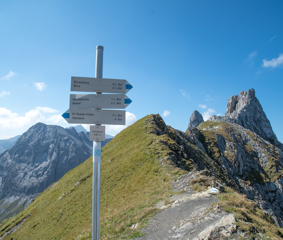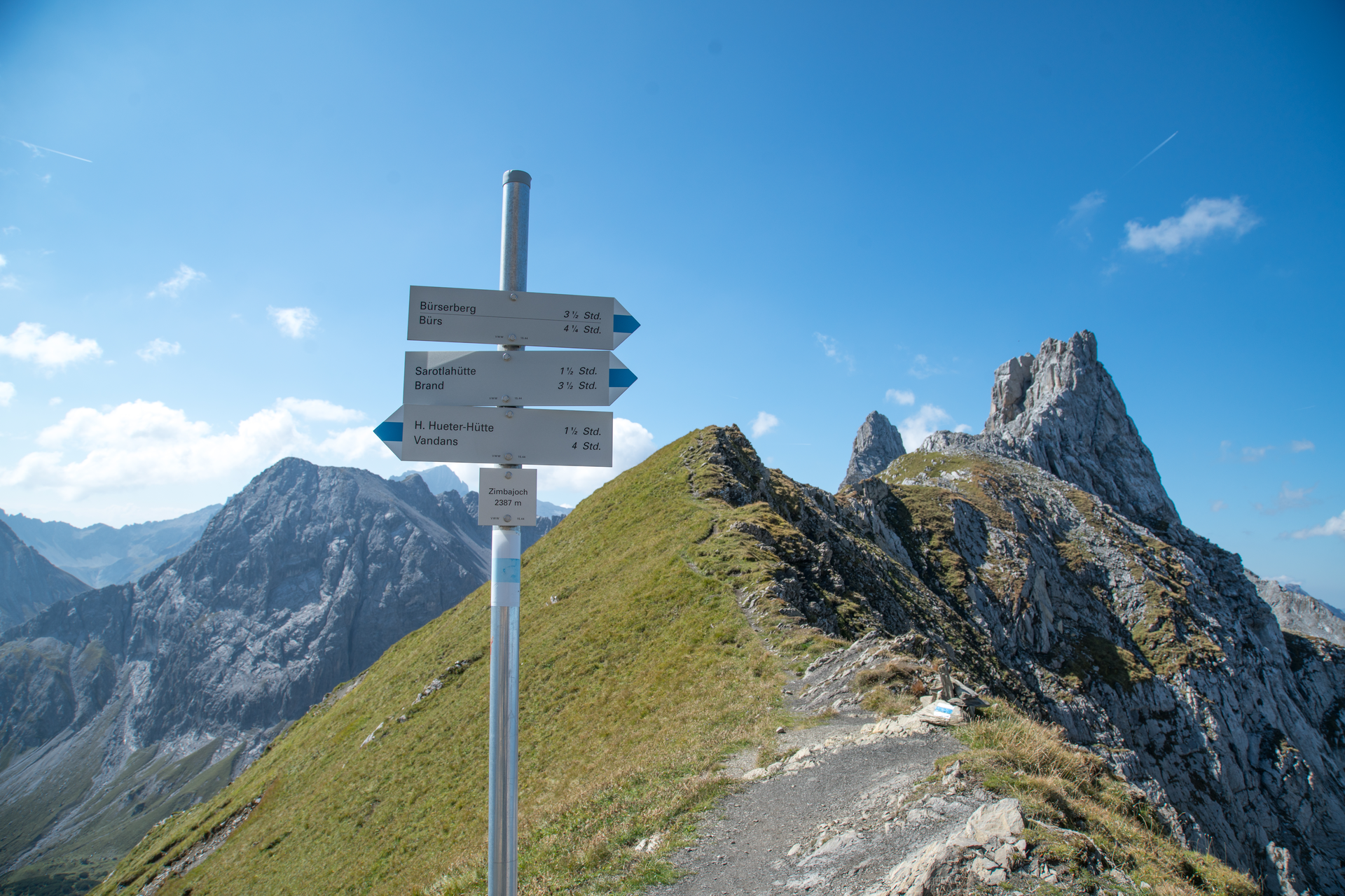 Diese Bergtour startet in der Ortsmitte von Brand. Hier wanderst Du entlang des Alvierbaches talauswärts bis der Weg ins Sarotlatal abzweigt. Der schöne Wanderweg führt entlang des Baches in mehreren Serpentinen zur Sarotlahütte hinauf. An der Sarotlahütte vorbei führt diese Bergwanderung nun noch kurz eben und dann über felsiges Gelände in mehreren Serpentinen hinauf auf das Zimbajoch (2.387 m).
