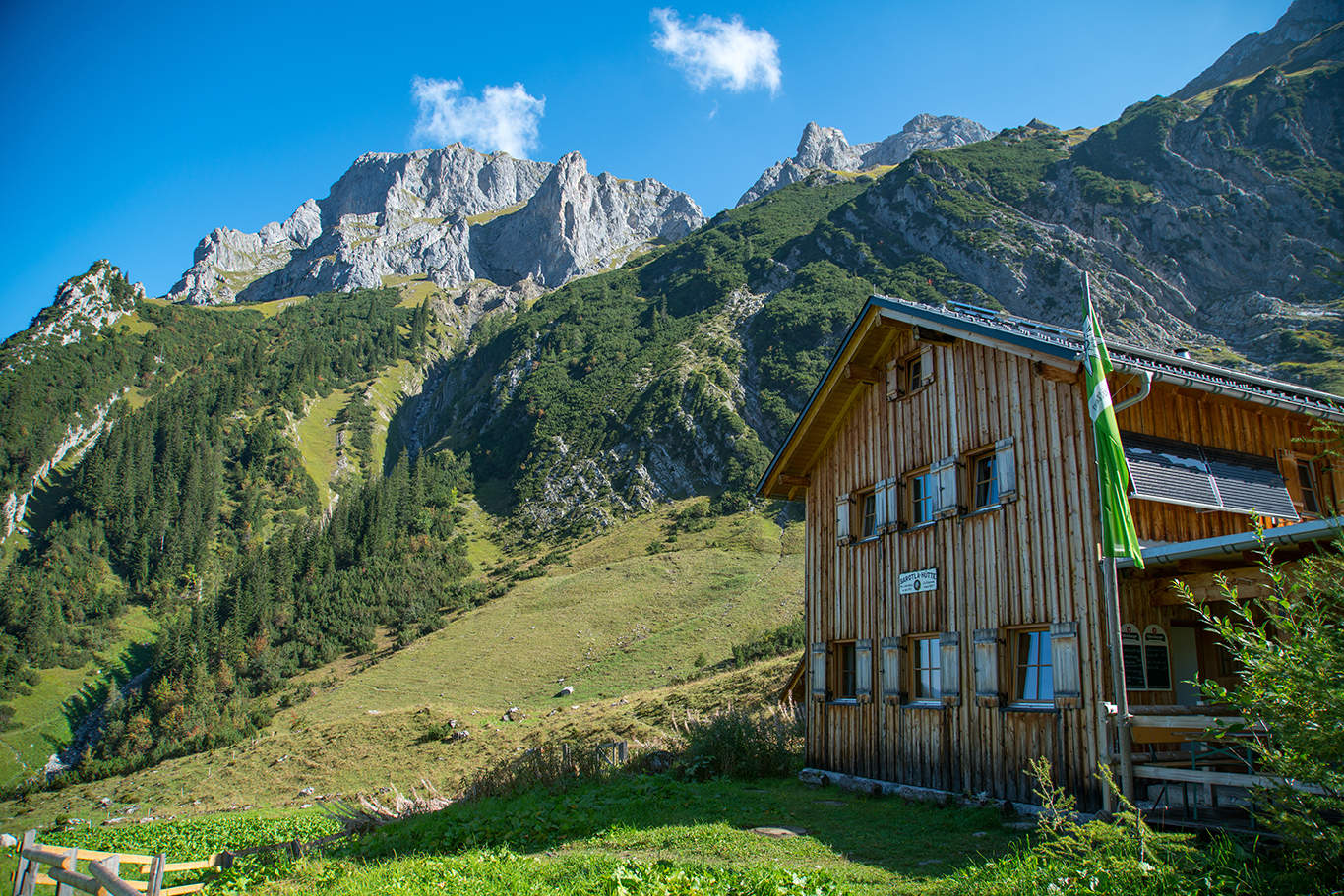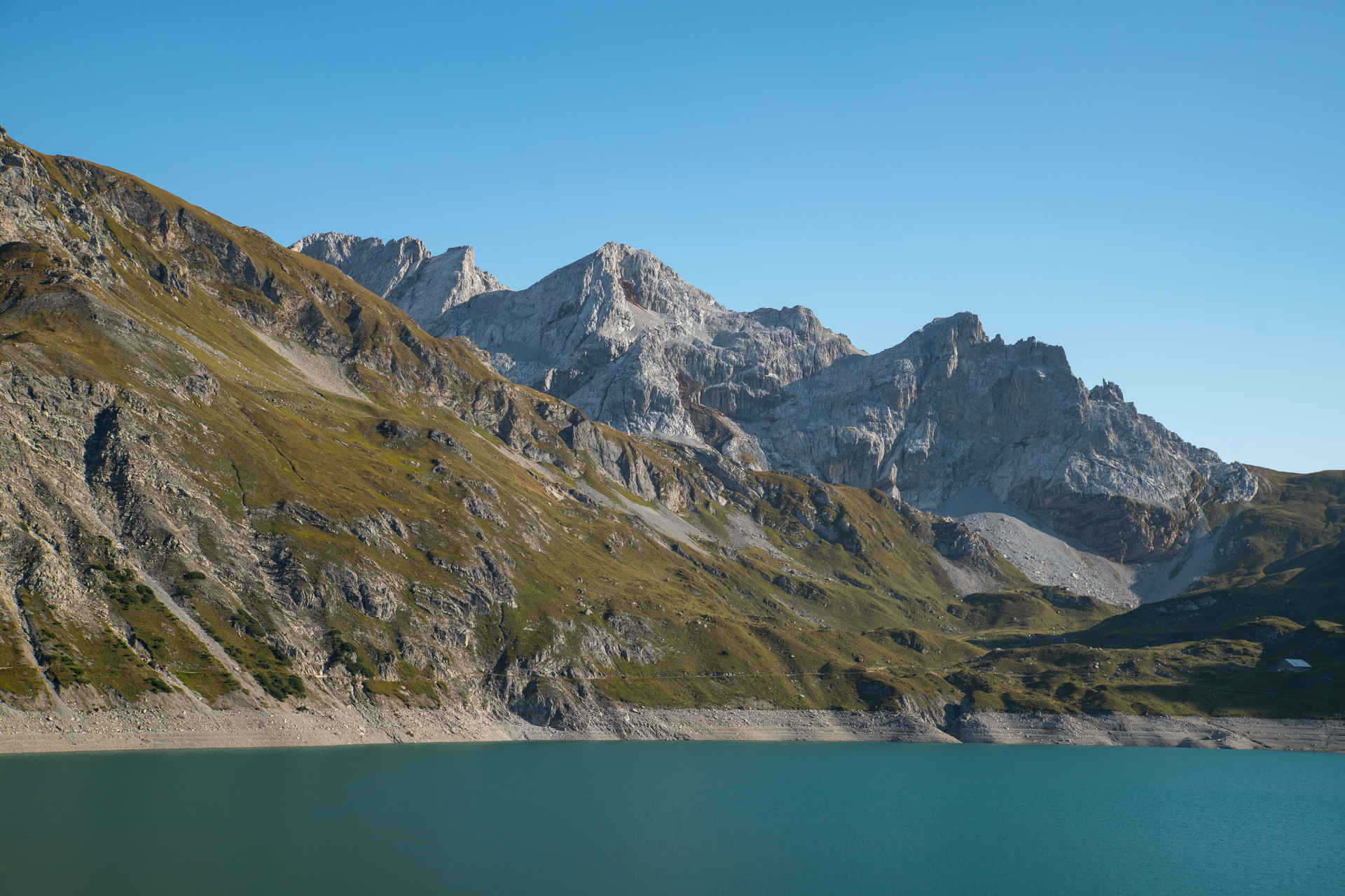 Auf der anderen Seite führt ein sehr steiler Zick-Zack-Pfad ebenfalls in felsigem Gelände hinab zur Heinrich-Hueter-Hütte. Nach einer kurzen Rast auf der Heinrich-Hueter-Hütte führt der Weg dann über den Gipsköpfleweg unterhalb des Schafgafalls hinauf zur Lünerkrinne. Von der Lünerkrinne geht es nun abwärts zum Lünersee und entlang des Lünersee-Rundweges weiter zur Douglasshütte.