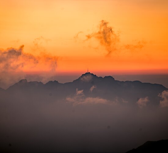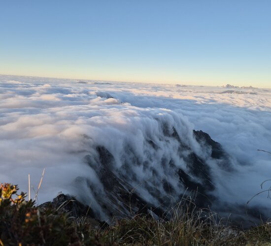 Unter den Gipfeln öffnet sich ein schier unendlich weites Meer aus Nebel und Wolken. Ein wahres Naturspektakel!