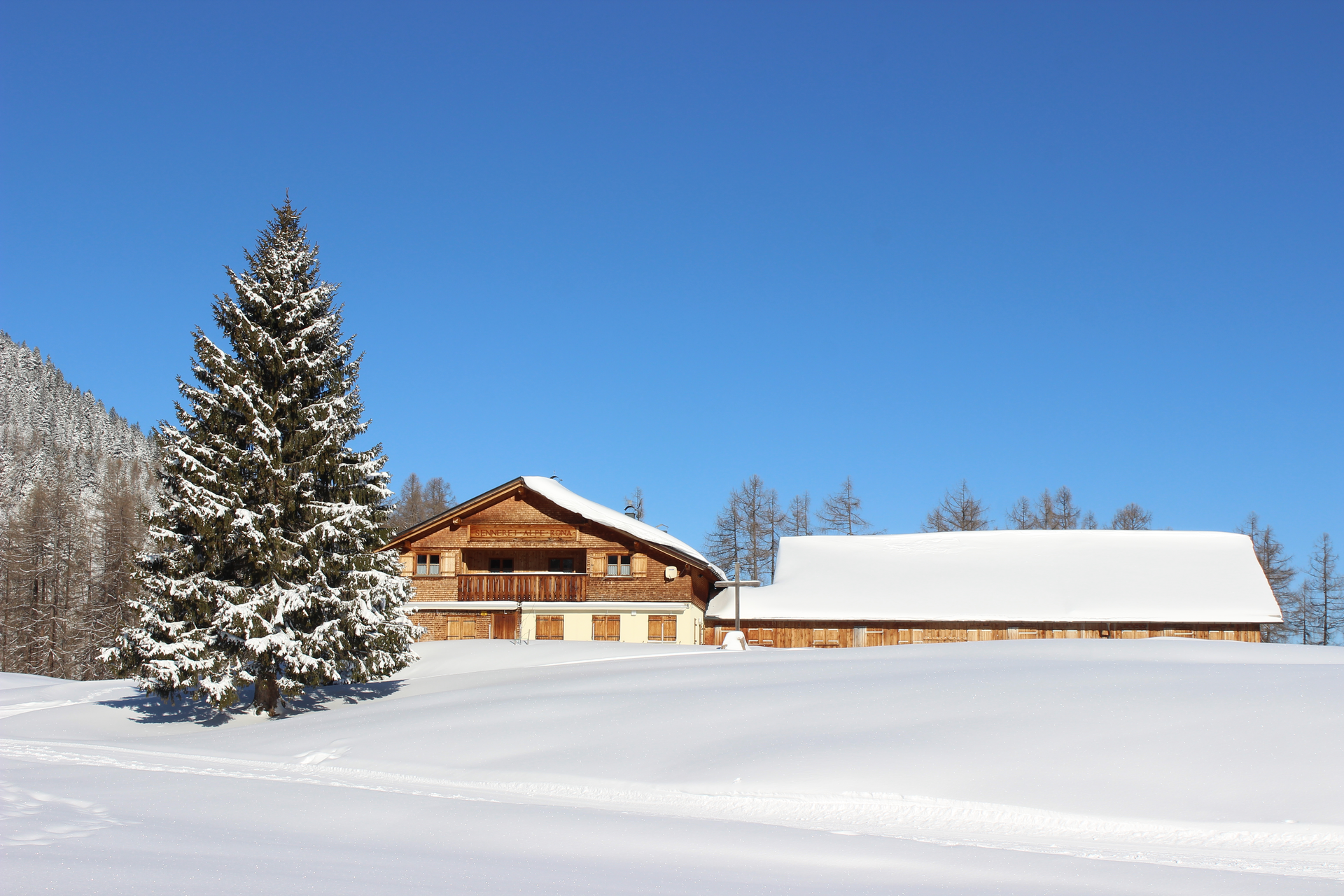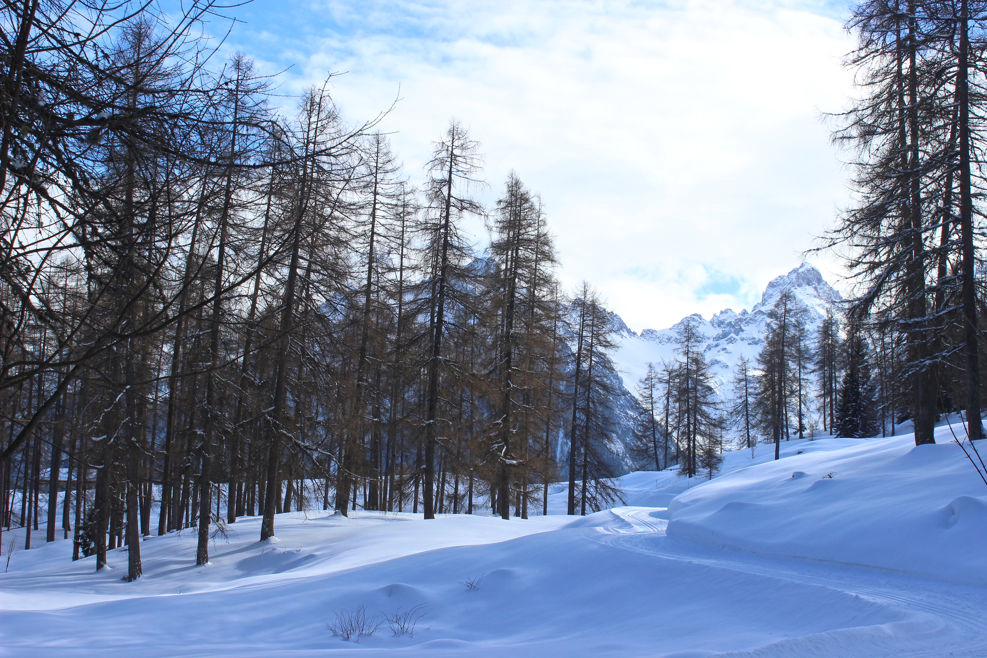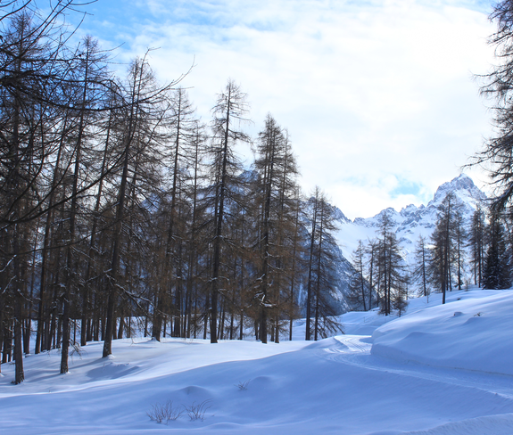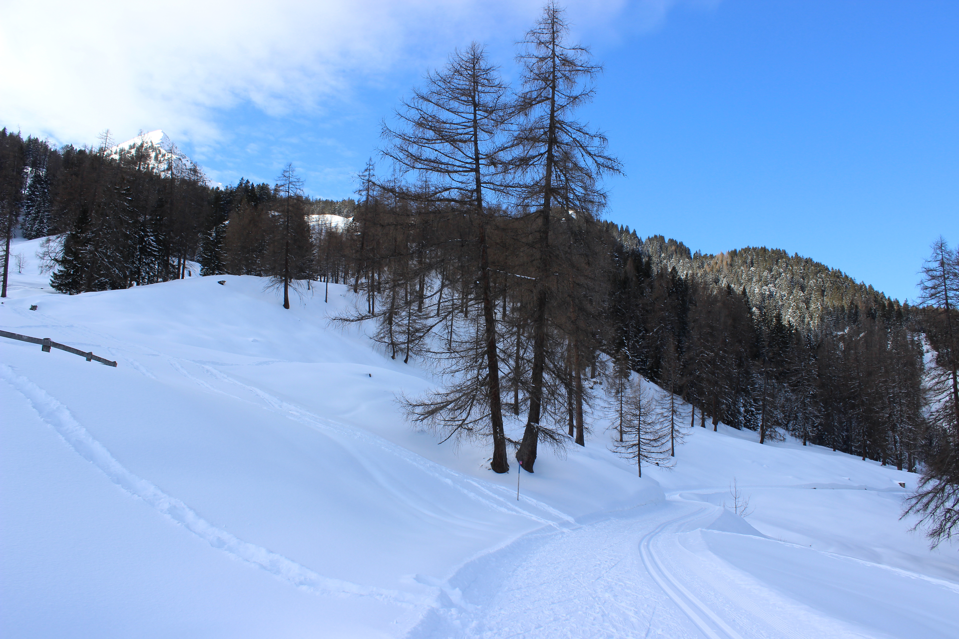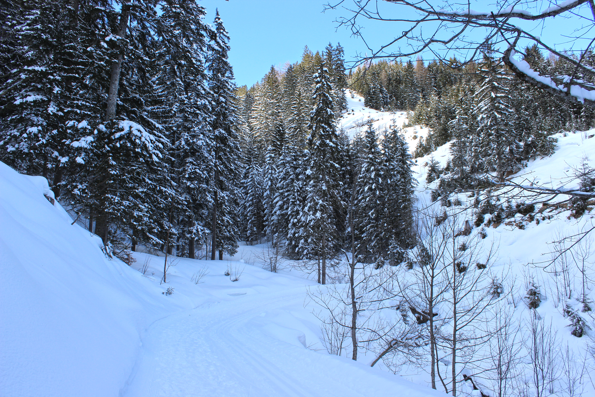 Atmospheric hike in the snowy winter forest and on the way back with a great view of the high plateau Tschengla.