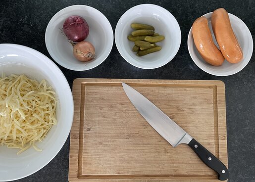 Der klassische Lumpensalat besteht aus 4 Zutaten: Schüblinge (so nennt man in Vorarlberg die "Knackwurst"), Bergkäse, Essiggurken und Zwiebel. Eine köstliche Marinade dazu – und fertig ist das ideale, regionale Sommergericht. Wir wünschen Guten Appetit!