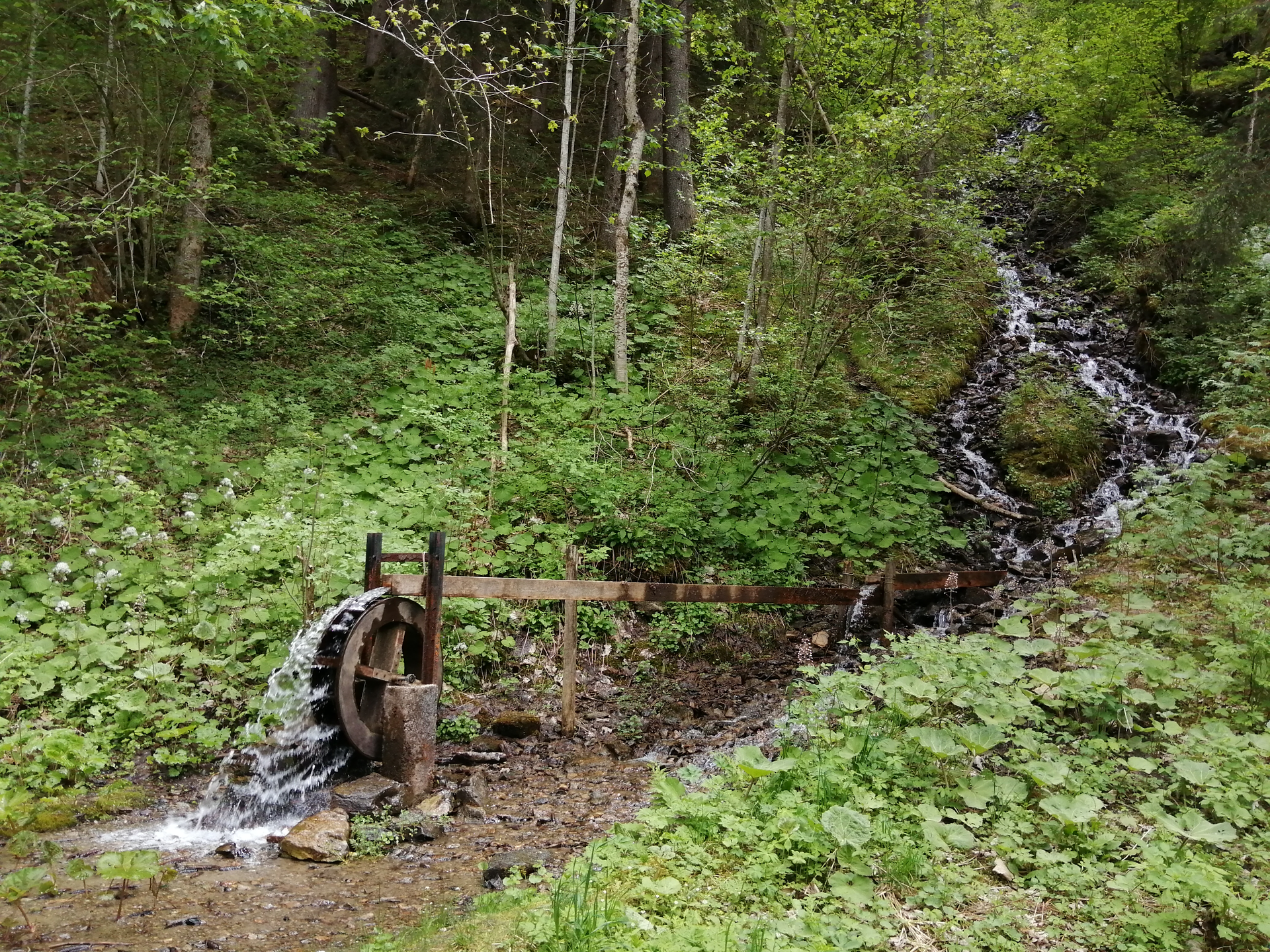 Gemütlicher Spazierweg zur Grillstelle mit Teich und Wasserrad an der Alfenz.