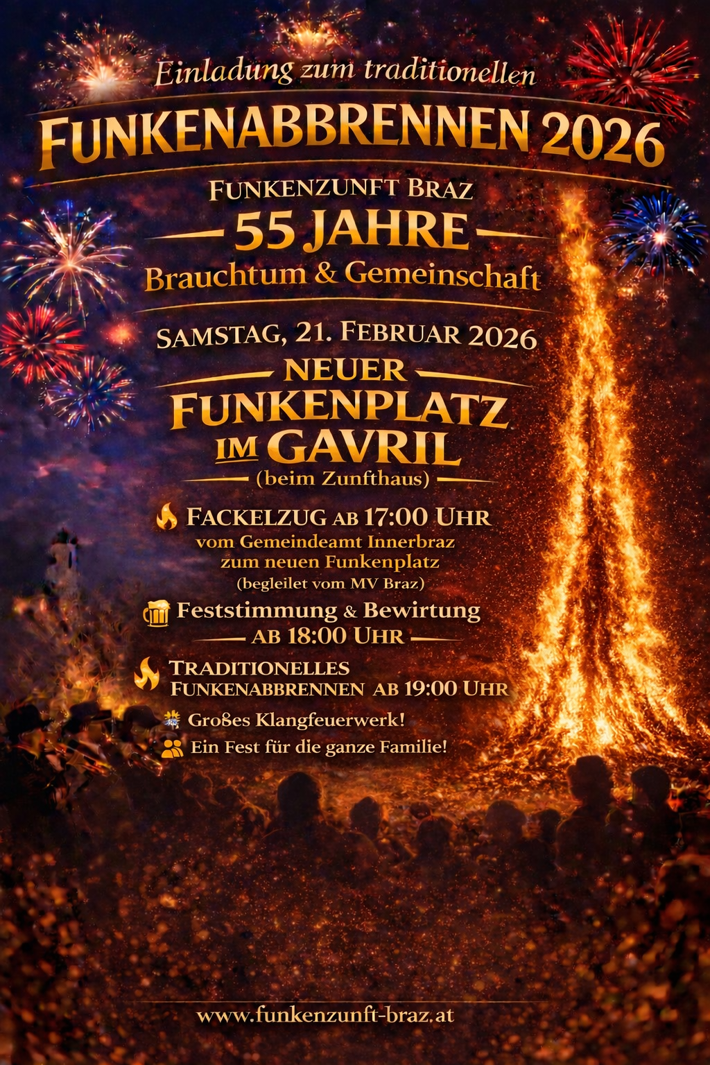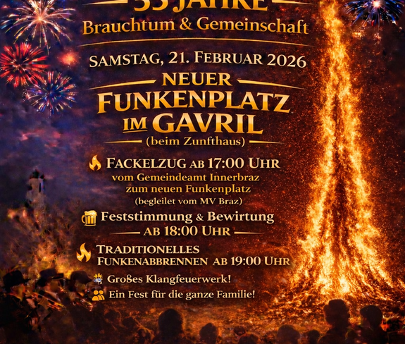 Fackelzug: ab 17:00 Uhr vom Gemeindeamt Innerbraz zum neuen Funkenplatz (begleitet vom Musikverein Braz)