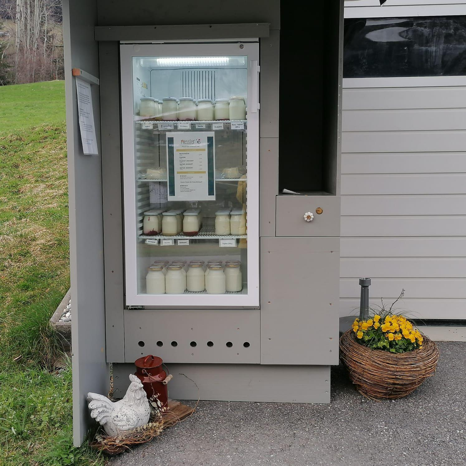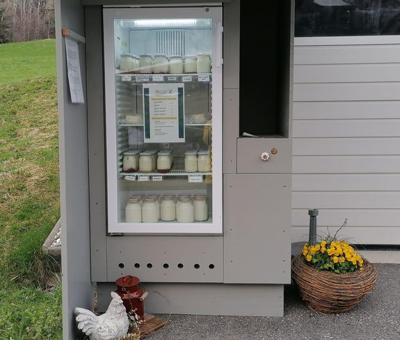 Rund um die Uhr sind frische saisonale Produkte wie Naturjoghurt, Frischkäse, Topfen, Würste erhältlich.