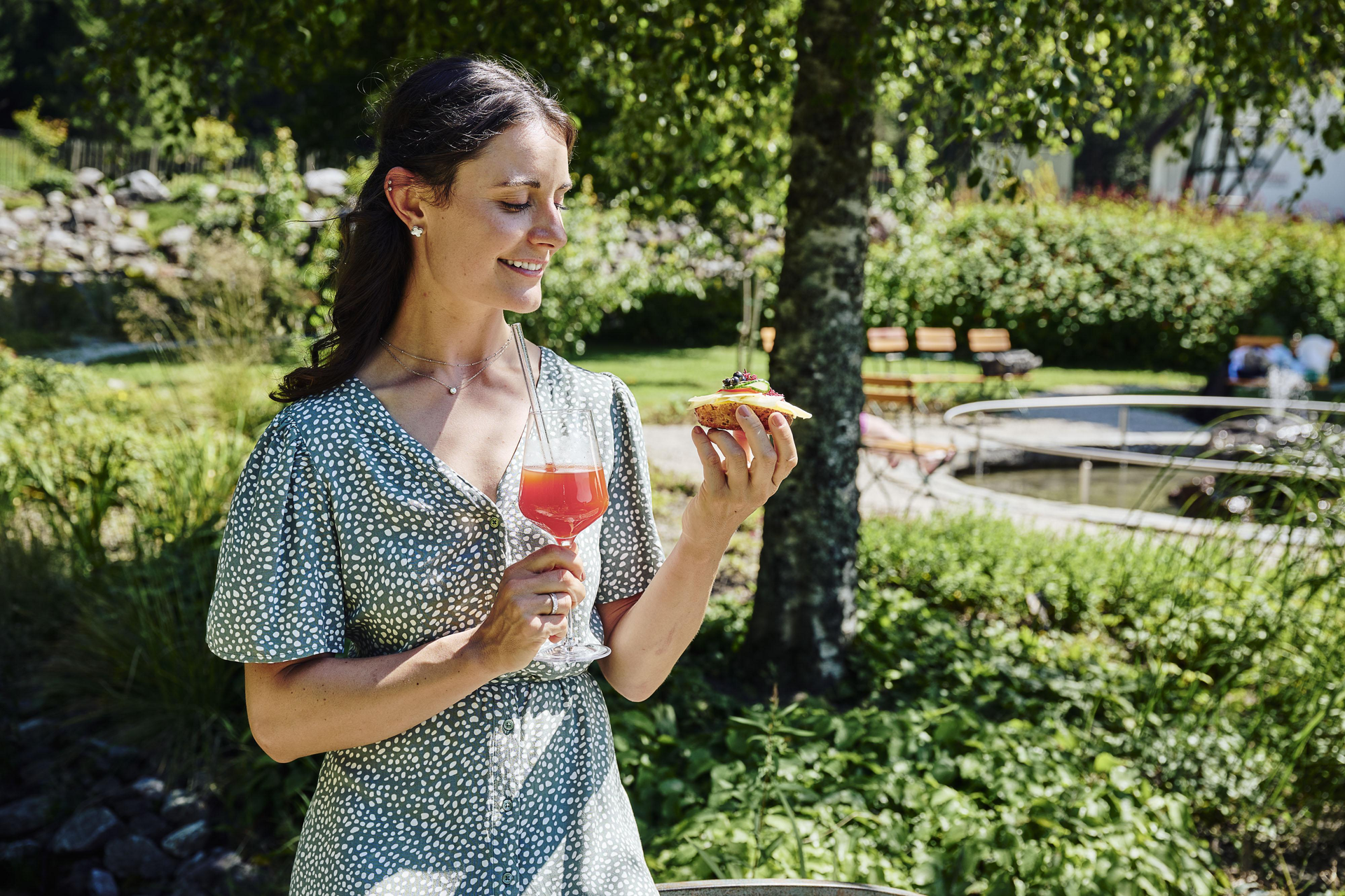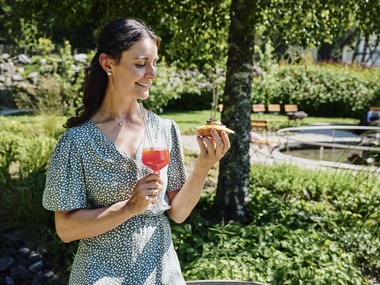 5. Genussstation: Dessert + 1 Glas Wein, Kaffee oder alkoholfreie Alternative durch Traube Braz | Im Garten des Hotels Traube Braz Alpen.Spa.Golf.Hotel mit Blick zum Masonwasserfall