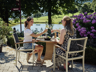 4. Genussstation: Hauptspeise + 1 Glas Wein oder alkoholfreie Alternative | Golfplatz Restaurant Braz, Terrasse am Wasser