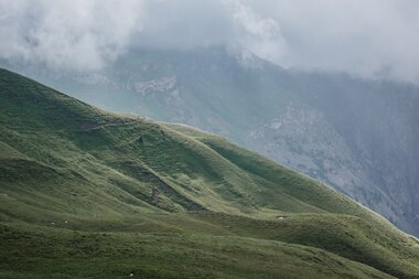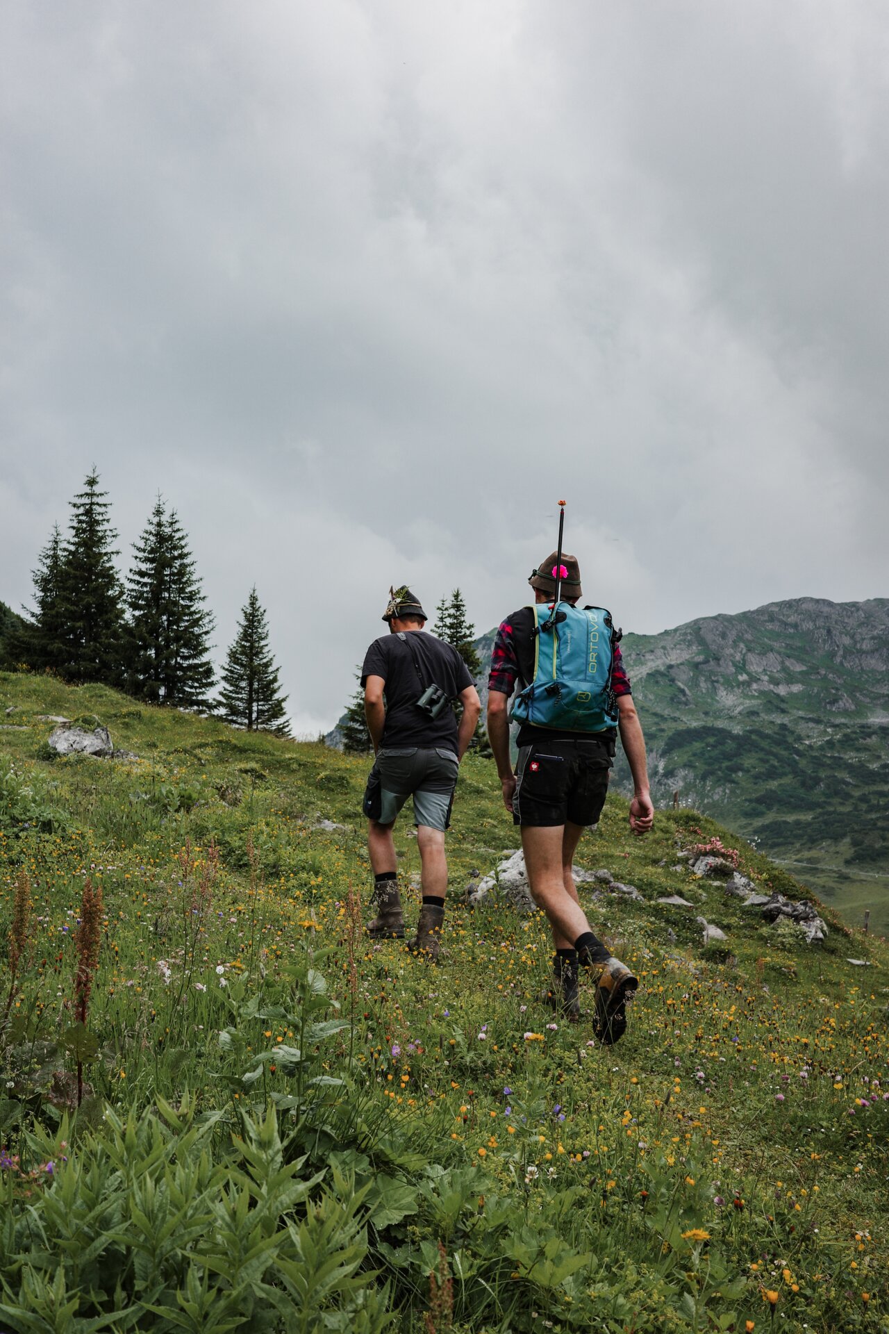 Ein typischer Tag der drei beginnt früh, oft schon um 6:00 Uhr. Täglich müssen die Tiere gezählt und begutachtet werden, selbst an einem regnerischen und windigen Morgen wie heute. Fast 200 Rinder grasen auf den weitläufigen Flächen der Alpe. Mit geübtem Blick überprüfen Daniel und Aurel zweimal täglich die Gesundheit der Tiere und legen dabei bis zu 30 Kilometer und 1.700 Höhenmeter zurück – ein anstrengender, aber erfüllender Tag.
