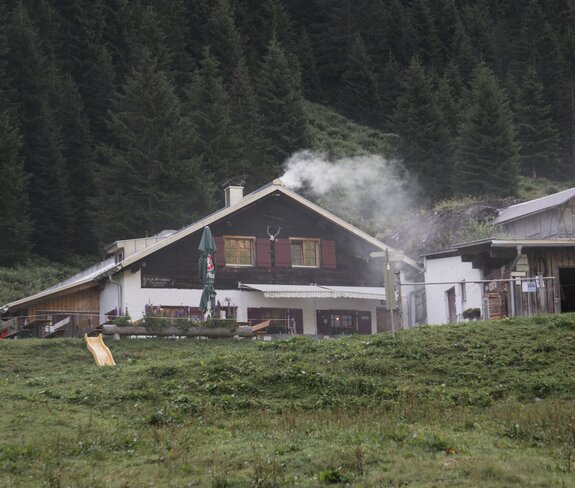 Es ist ein stiller Morgen auf der Alpe Nenzigast. Rauchschwaden steigen aus dem Kamin von Peters Alphütte, die nicht nur das Zuhause der Alpleute, sondern auch die Sennstube beherbergt. Die Hütte liegt noch im Schatten der umliegenden Berge, während der Gebirgsbach in der Nähe laut und deutlich plätschert. Hier oben gibt es kaum Handyempfang – die Verbindung zur Außenwelt ist minimal.