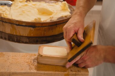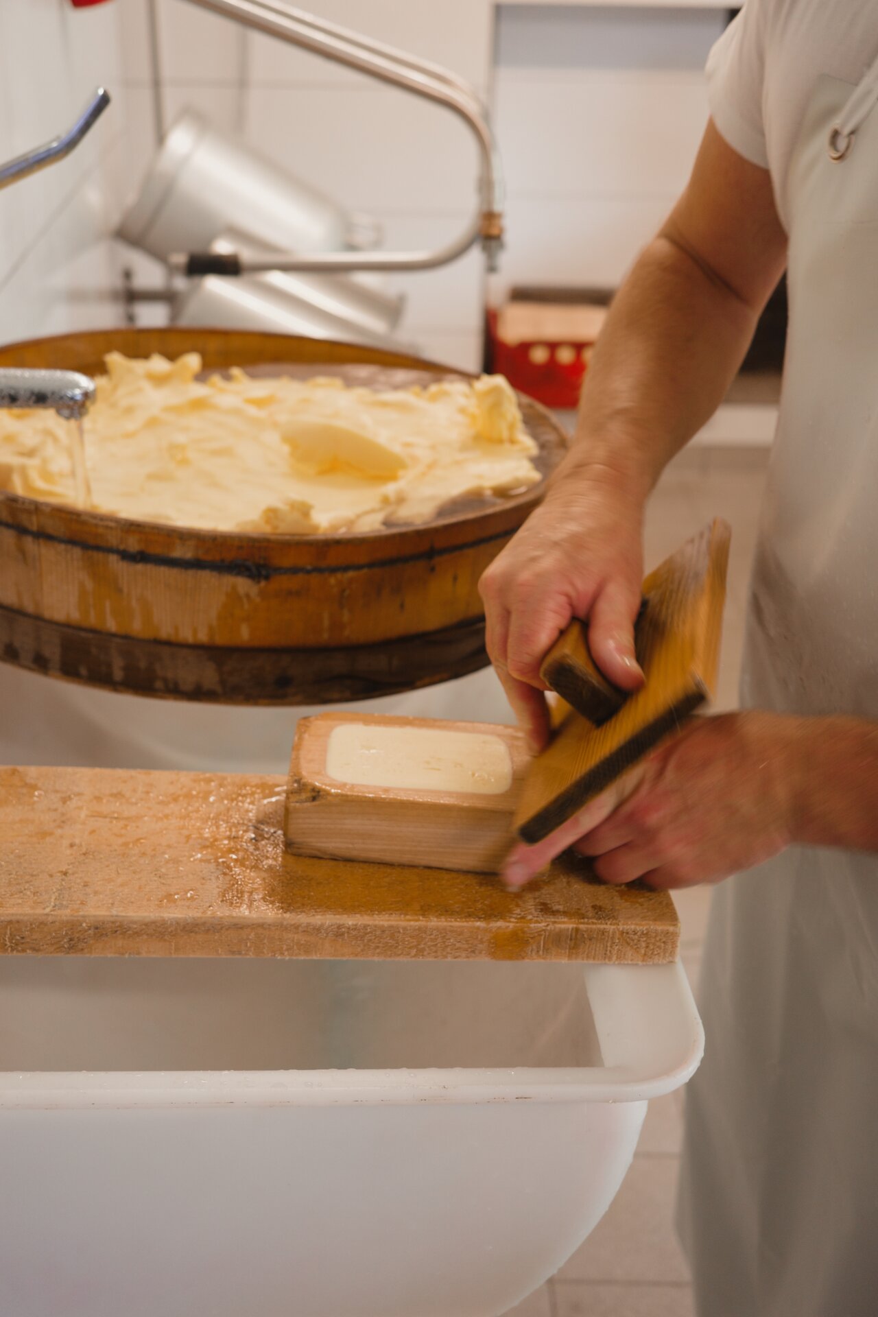 Um 7:00 Uhr fließt die frisch gemolkene Milch aus dem Stall direkt in den großen traditionellen Kupferkessel, der auf der Alpe seit Generationen genutzt wird. Mit Fichten- und Tannenholz, das in der Umgebung wächst, wird der Kessel erhitzt. Nach etwa 35 Minuten schneidet Peter die inzwischen dick gewordene Milchmasse mit der Harfe, einem Spezialwerkzeug zur Käseherstellung. Jede Handlung wird sorgfältig auf einem Blatt Papier notiert.