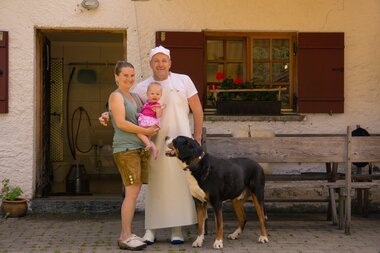 Während Peter in der Sennstube arbeitet, widmet sich Barbara anderen Aufgaben. Sie backt frisches Brot im Holzofen vor der Hütte und bewirtet die Gäste, die auf die Alpe kommen. Tochter Lorena ist oft mit dabei, und so auch der Familienhund Dexter, ein Berner Sennenhund.