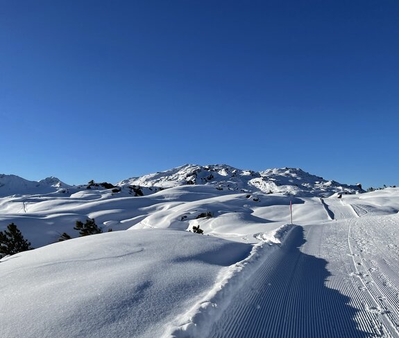 Auf dem Weg zurück zur Bergstation entdecke ich im Schnee eine einfache Botschaft: „Danke“. Ein Wort, das in diesem Moment genau das ausdrückt, was ich fühle – Dankbarkeit für diesen Tag und den Winter auf dem Sonnenkopf, während anderswo bereits der Frühling Einzug gehalten hat.