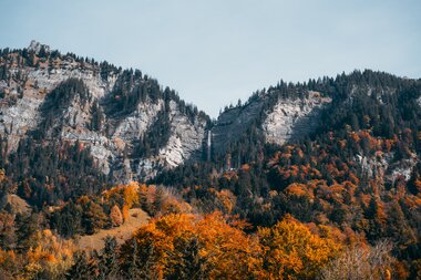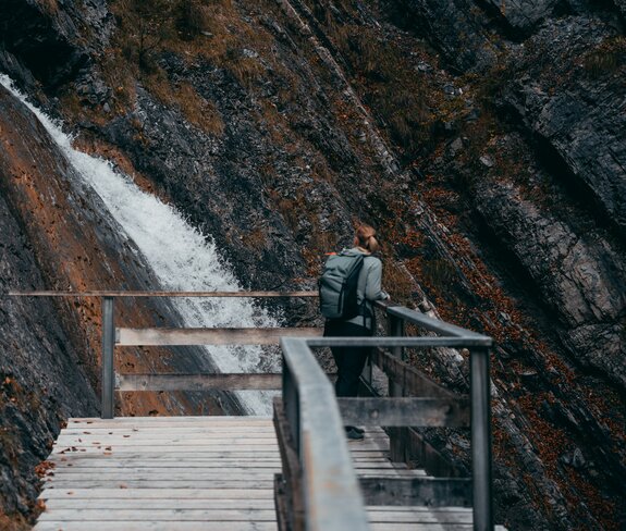 Der Fallbach-Wasserfall gehört zu den größten Österreichs: die Fallbachwand ragt hoch über den beiden Feriendörfern Dalaas und Braz empor. Das Wasser stürzt dort über die steile Felskante von 1.400 Meter Höhe hinab. Wie ein gleißendes, weißes Band, sieht der Fallbach aus der Ferne aus. Der Anblick dieses beeindruckenden Naturschauspiels regt Gedankenspiele an: während das Wasser in einem stetigen Strom fließt, scheint der Wasserfall selbst in seiner Form beständig. Wir spüren die Macht der Natur und erkennen darin auch ihre unbestechliche Schönheit. Dieser Naturgewalt wohnt gleichzeitig eine schöpferische Kraft inne. Das Wasser, das sich über Felsen und Klippen ergießt, formt die Landschaft, gestaltet Täler, Höhlen und Seen. Der Prozess mag gewaltsam erscheinen, ist gleichzeitig aber Quelle neuen Lebens – Pflanzen gedeihen, Tiere finden Lebensraum. Ein Panoramasteig bringt Dich bis zum Fuße des imposanten Fallbach-Wasserfalls; eine anspruchsvolle Kletterroute führt die steile Fallbachwand empor und bietet beeindruckende Weitblicke.