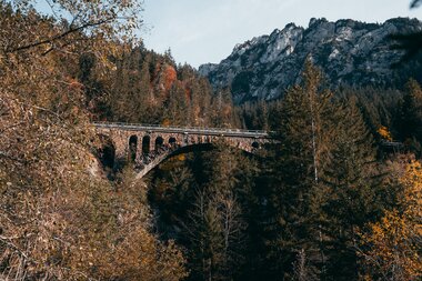 Das Klostertal hat jedoch noch weitere Sehenswürdigkeiten zu bieten, die durch das Element Wasser geprägt sind. In der Ortschaft Klösterle befindet sich mit der Wäldletobelbrücke ein Highlight der Kunstbauten der Arlbergbahn. Das eindrucksvolle Viadukt ist Zeugnis der Handwerkskunst trentinischer Maurer, die das Gebäude im Zuge der Errichtung der Arlbergstrecke erbauten. Heute kann hier ein Lehrweg begangen werden, der bis in die eindrucksvolle Wäldletobelschlucht führt. Dort rauscht der Wäldlebach unablässig über fast senkrechte Felswände hinab Richtung Tal. Nach Unwettern kann der sprudelnde Wildbach zu einem reißenden Strom anschwellen und eine mitunter zerstörerische Kraft entwickeln. An warmen Sommertagen belebt Dich die kühle Frische seiner Gischt, die aus der Tiefe emporsteigt.