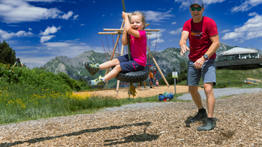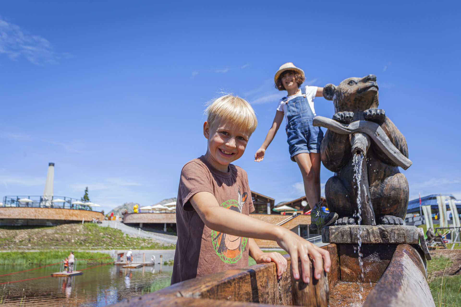 Schon an der Bergstation hört ihr das fröhliche Lachen anderer Kinder – nur den Hügel hinunter springen, und ihr seid im Bärenland. Über 30 Spielstationen laden zum Entdecken ein: spannende Rätsel lösen, mit dem Floß fahren, die Kletterwand erklimmen und vieles mehr. Vielleicht findet ihr einen der versteckten Bärentaler im Schürffeld. Für die Erwachsenen gibt es gemütliche Rastplätze, wo sie beim Anblick des 360°-Bergpanoramas Entspannung finden – was könnte schöner sein?