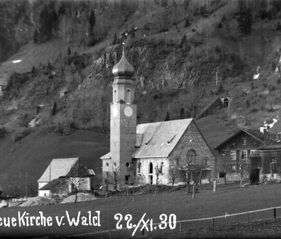 Nachdem durch den Bau der Arlbergbahn 1880 bis 1884 und insbesondere den Bau des Spullerseekraftwerks 1920 bis 1925 die Bevölkerung von Wald massiv zugenommen hatte, wurde ein Neubau nötig. Der damalige Kurat Johann Josef Fiel nahm diesen in wirtschaftlich schwierigen Zeiten 1930 in Angriff. Die Pläne lieferte der bekannte Architekt Willibald Braun aus Bregenz. Einen modernen Kirchenbau wollte er der dörflichen Bevölkerung offenbar nicht zumuten und entschied sich daher für einen eher konservativen, neubarocken Stil.