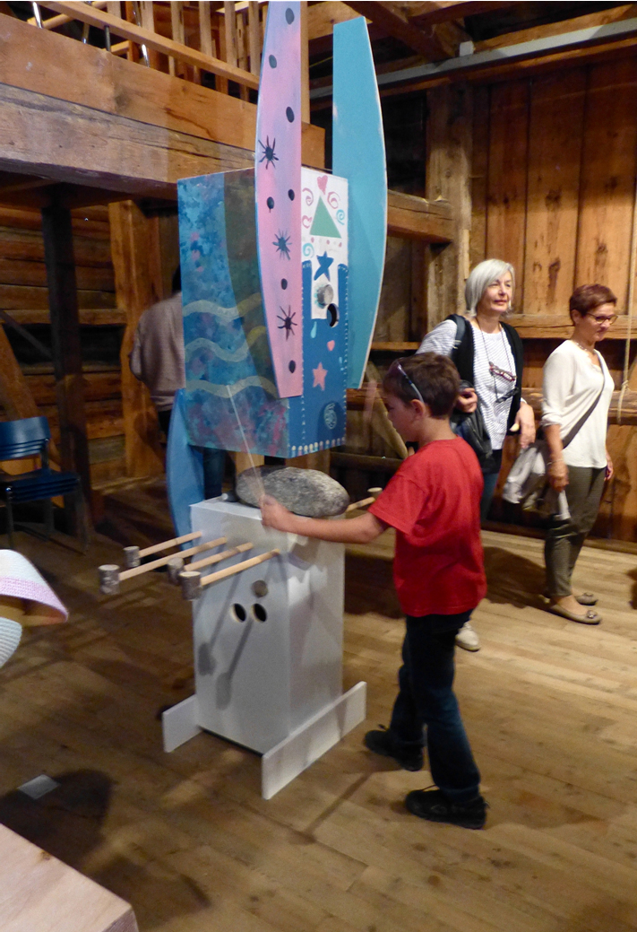 Gleich nach der Trocknung konnte der Klangkörper spontan bespielt werden. Dabei ist dem Objekt ein ganzer "Wasserfall" an Tönen, Klängen, Geräuschen und hörbaren Schwingungen entsprungen, mit weitreichenden Stimmigkeiten. Ob einzeln oder in der Gruppe, mit dem Objekt können eigene Perkussionsstrukturen und Tonpfade gefunden werden.