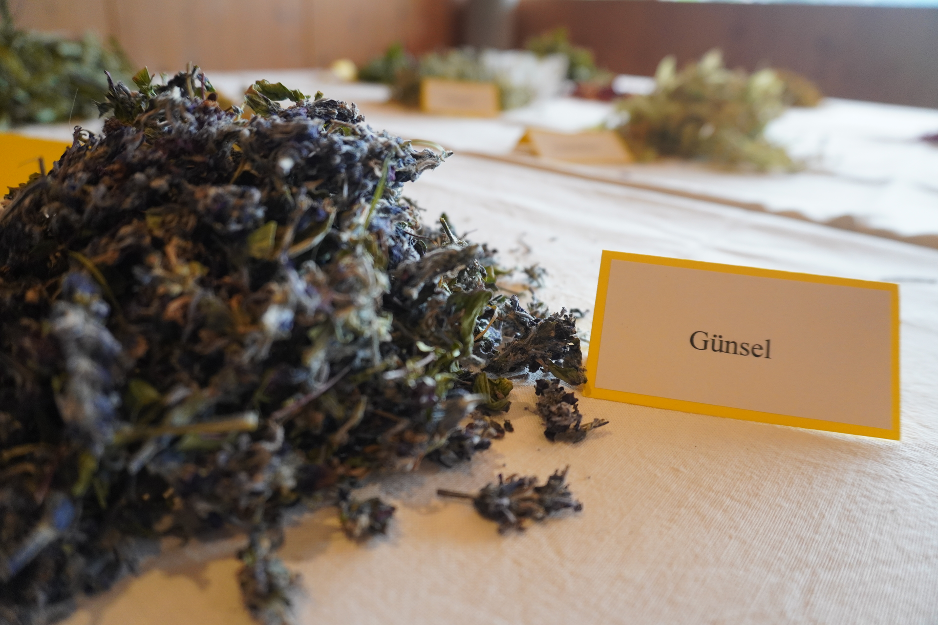 Elisabeth, eine gebürtige Walsertalerin, begrüßt uns. Eine lange Tafel mit vielen verschiedenen getrockneten Kräutern ist bereits vorbereitet. Sie erzählt uns von der Entstehungsgeschichte des Projekts und was ihr Sohn damit zu tun hatte. Besonders spannend sind die Geschichten aus den „Tee-Plaudereien“. Das sind Treffen mit älteren Talbewohnerinnen, die ihr Wissen über Kräuter und Tees bereitwillig teilen. Es ist inspirierend zu hören, wie dieses bedeutende Wissen über Generationen weitergegeben wird.