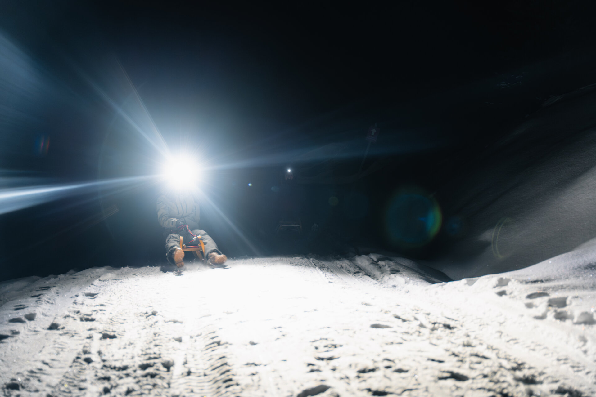 Den Rückweg treten wir nun mit unseren mitgebrachten Rodeln an. Die Abfahrt durch den mondbeschienenen Wald ist ein ruhiges, aber zugleich aufregendes Erlebnis. Der Schnee glitzert im sanften Licht und das leise Rauschen der Kufen im Schnee verstärkt die friedliche Atmosphäre. Hier geht es nicht um Geschwindigkeit, sondern darum, die Natur in vollen Zügen zu genießen – ohne Ablenkung, ohne Eile.