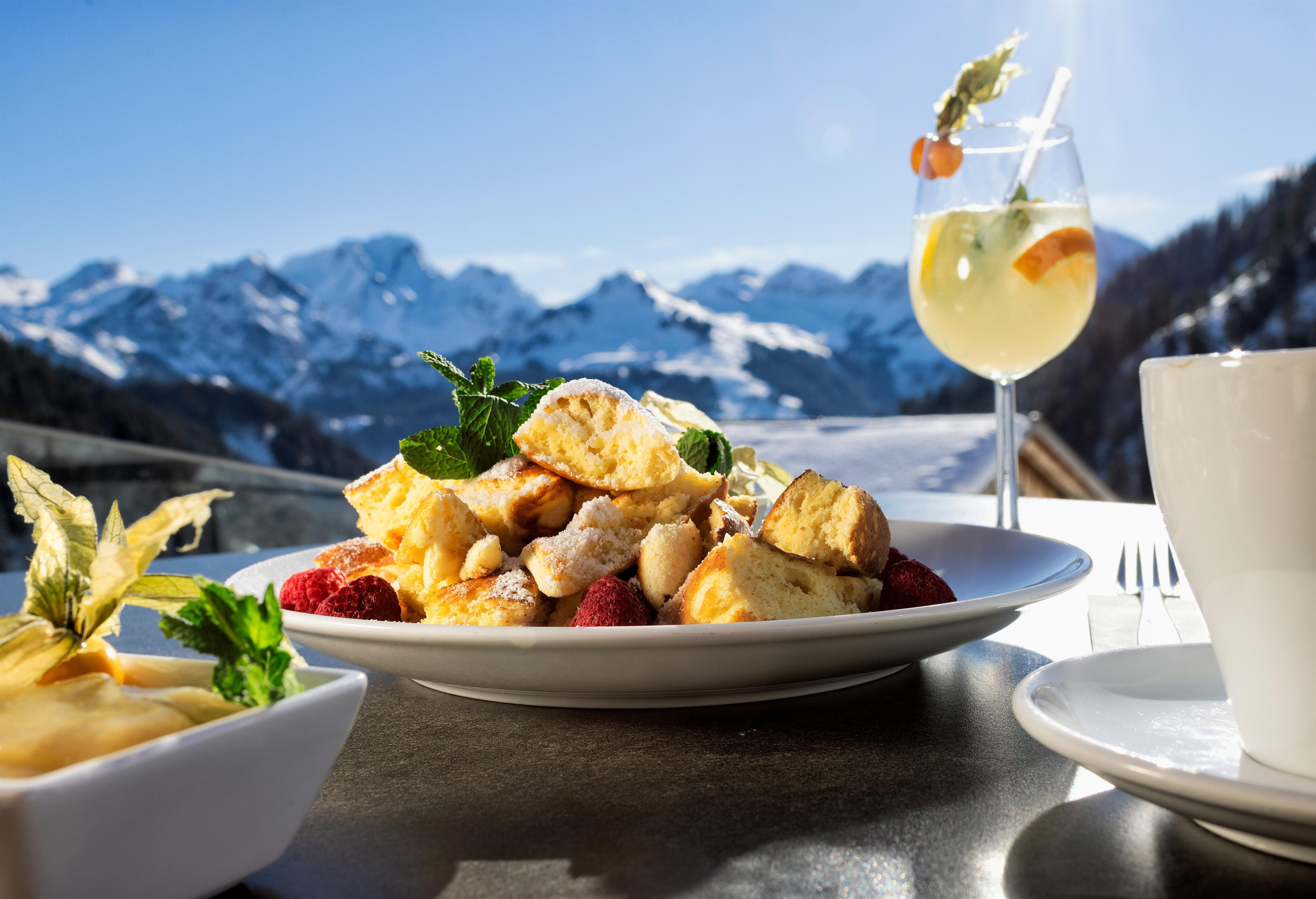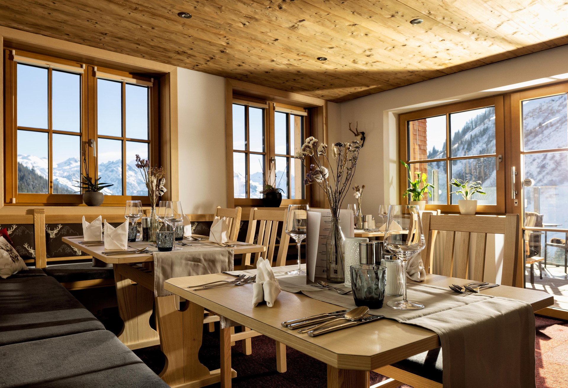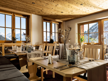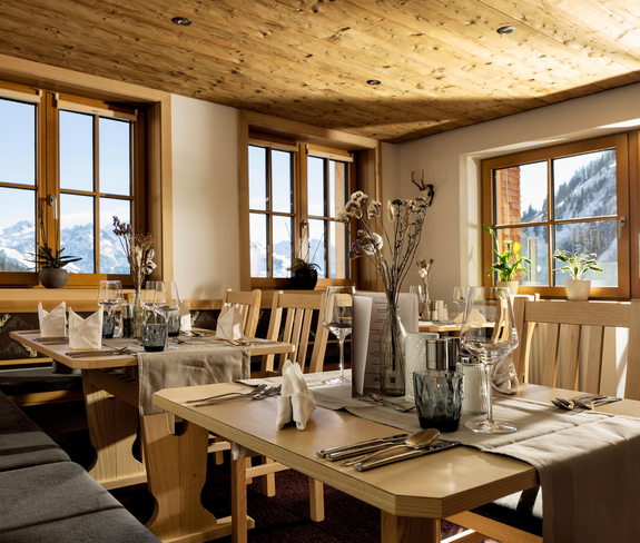 Tagesgäste sind uf´d Sonnasita jederzeit herzlich willkommen. Eine überdachte Terrasse bietet neben dem Restaurant drinnen noch mehr Platz zum Einkehren. Hier genießt ihr Walser Spezialitäten (auch vegetarische Speisen) und einen sensationellen Ausblick.