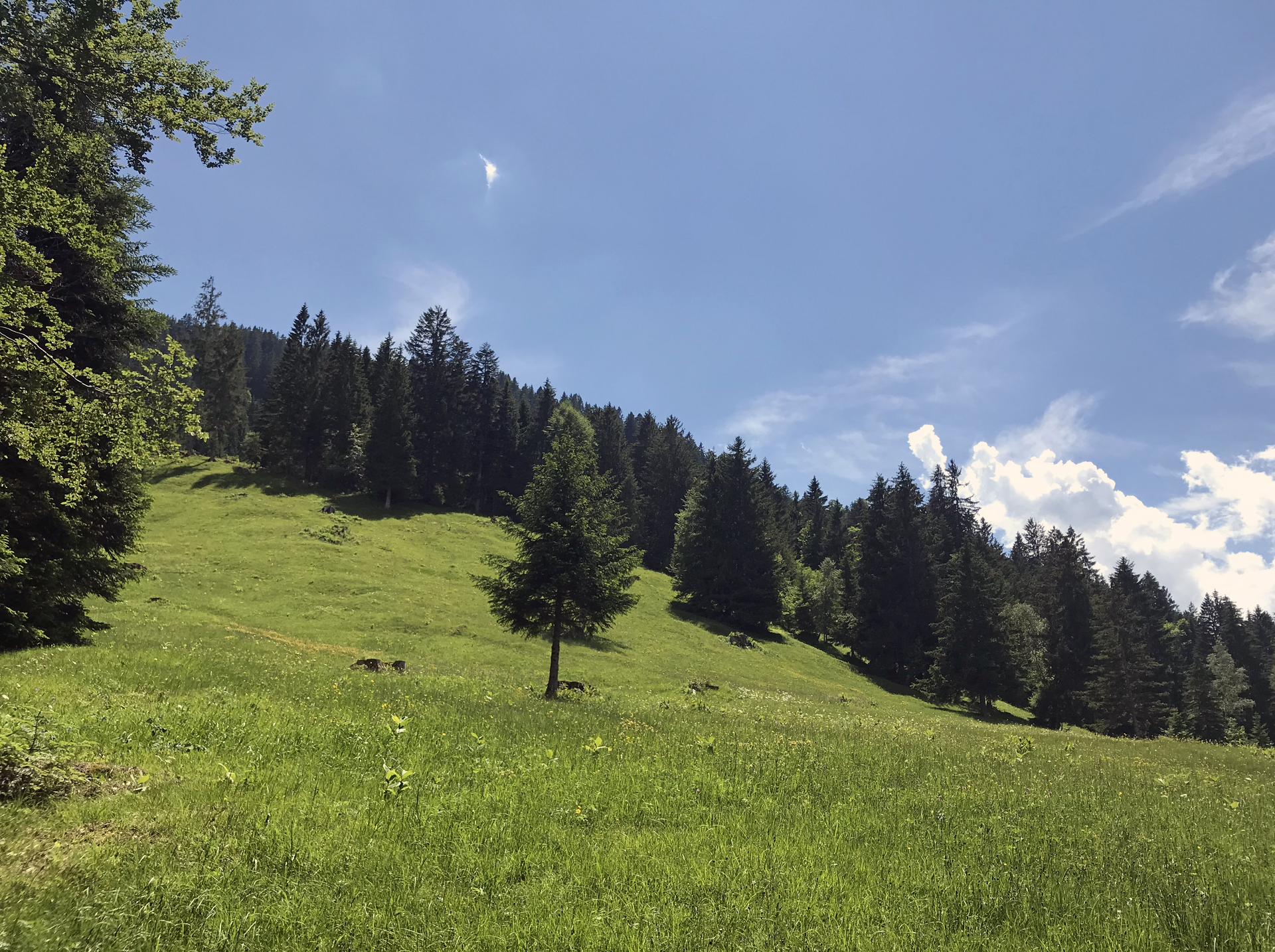 Am Ende des Wieswegs geht es auf dem Güterweg Ludescherberg leicht ansteigend bis zur Weggabelung. Dort den oberen Weg nehmen, welcher zur Parzelle Grüneck führt. Eine herrliche Aussicht über den Walgau bis hin zu den Schweizer Bergen erwartet Dich. Am Haus Nr. 80 gelangst Du auf den Labomweg, welcher wiederum an zahlreichen Heubargen, Mager- und Streuwiesen vorbei führt.